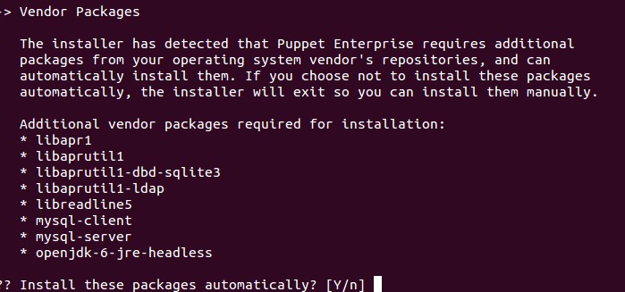 13) You will be prompted to install additional packages that have been detected for Puppet Enterprise from the operating system vendor repositories, select (Y)es.