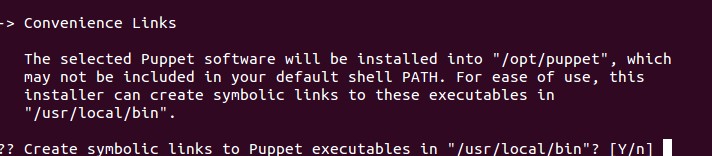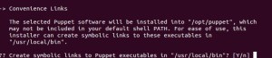 14) You will be prompted to create symbolic links to the Puppet software executables in /user/local/bin, select (Y)es.