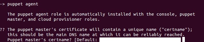 7) Accept the default values (FQDN) for the puppet master certificate for the puppet agent, select Enter.