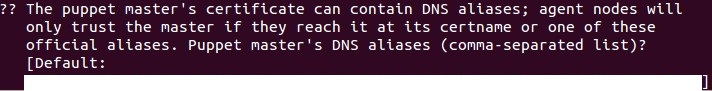 8) Accept the default values for the puppet master certificate DNS aliases. select Enter.