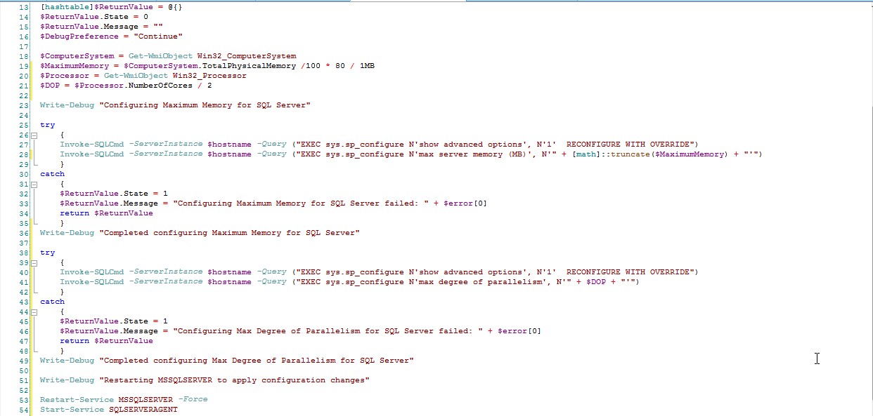 In order to set the value of both the maximum server memory and max degree of parallelism, the total physical memory and number of cores is retrieved using WMI and then a basic calculation is returned to set the configured value. For maximum memory the configured value is rounded towards zero using the math.truncate method.