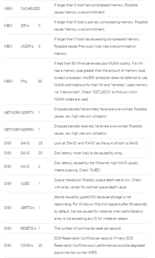 The below is a list of ESXTOP metrics and thresholds for reference taken from Duncan Epping at http://www.yellow-bricks.com/esxtop/