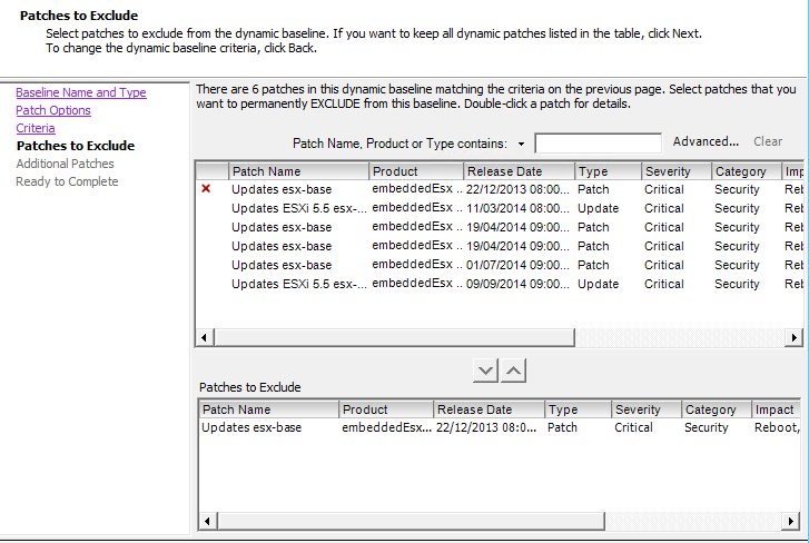 The dynamic baseline will now list the patches that meet the criteria specified where additional options are provided to permanently exclude the patches from the baseline. In this example, we will exclude the Patch ID ‘ESXi550-20131201-SG’.