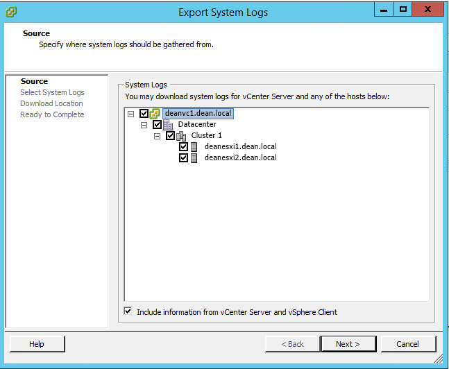 4) Specify the vCenter Server system and ESXi host systems to download system logs and select Next.