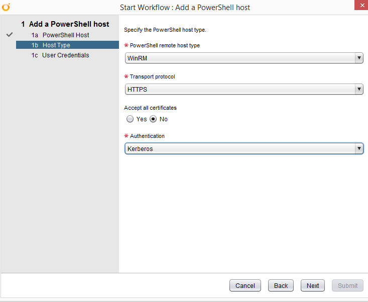 The Poweshell plug-in supports communication using the WinRM and SSH protocols, in this article we will concentrate on WinRM as the communication protocol over HTTPS using Kerberos authentication. We can enable the WinRM host to support Kerberos authentication, by invoking the following from a command prompt with elevated privileges: