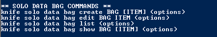 Once installed we can confirm we have a list of available knife solo command options available, as below: