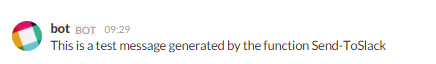 Send-ToSlack -Channel "#apitest" -Text "This is a test message generated by the function Send-ToSlack" -Token "xoxp-17822671332-9811436111-15776151506-a5a9c3855" Successfully sent the message to the slack channel #apitest.
