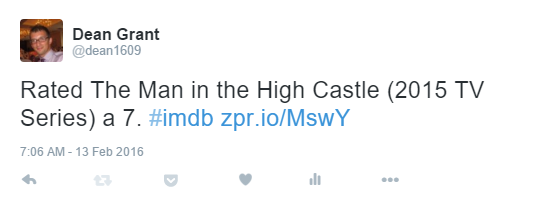 Data In message: Rated The Man in the High Castle (2015 TV Series) a 7. #imdb http://www.imdb.com/title/tt1740299/ Data Out N/A