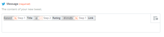 Now back to posting the message to Twitter we can select the following field items to generate the message as per my requirements. Field items prefixed with Step 1 are items returned from the RSS app and Step 2 being data returned from the Code app.